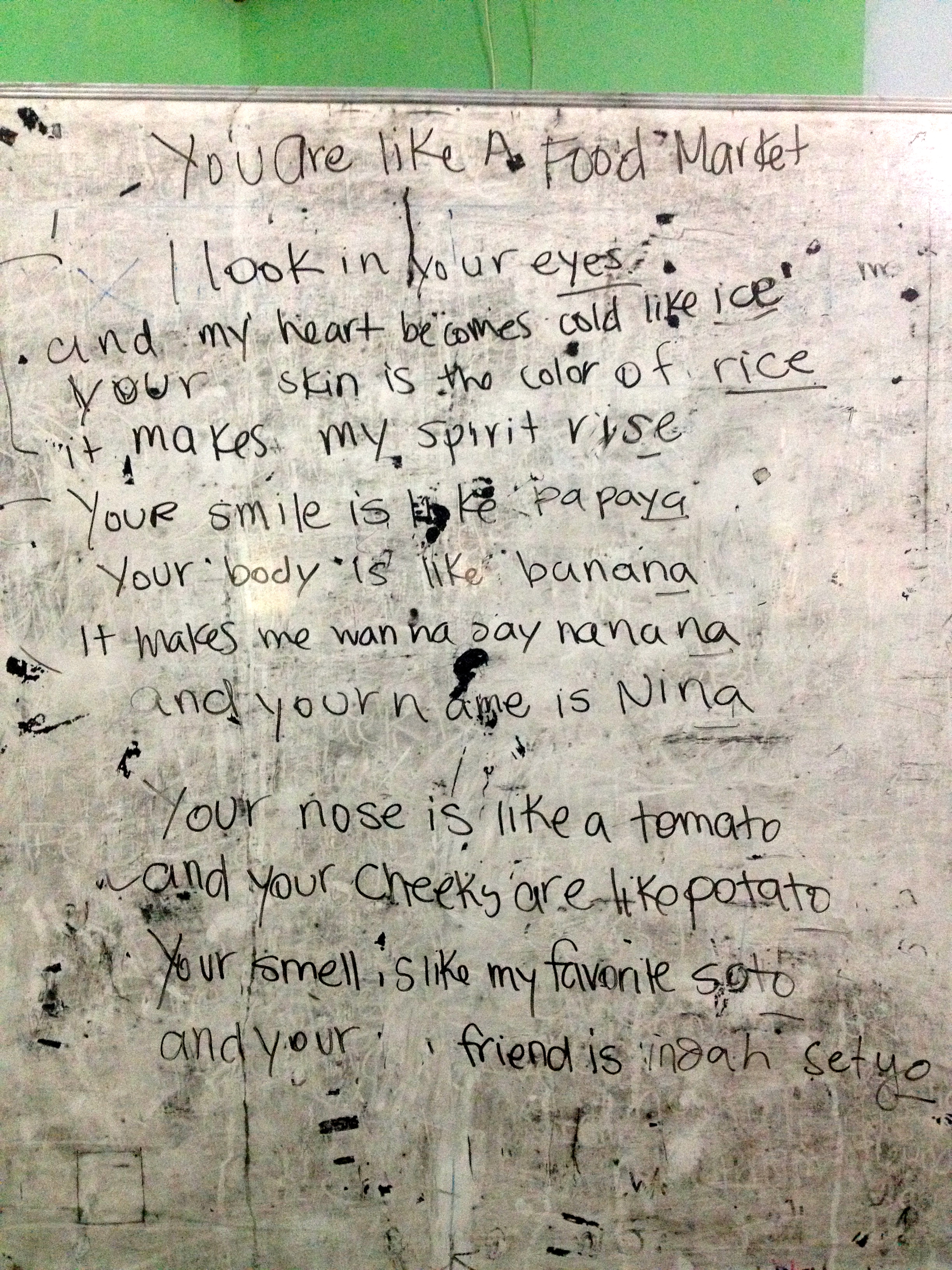 english club poem Published February 18, 2013 at 2448 × 3264 in Rhymes On Paper Hearts ← Previous “Your skin is the color of rice” – best Indonesian pickup line ever.