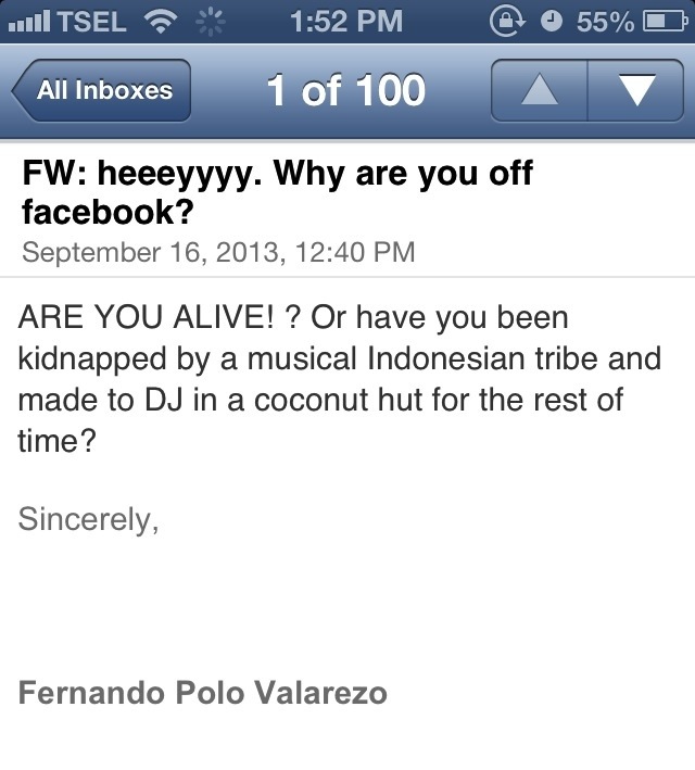 In order to reduce this—and maintain my sanity—I’ve been decreasing my exposure to noise. I’m listening to a lot more music with headphones, since it’s more controlled that the random rhapsodic creations Indonesia arranges for me, and more importantly, I’m reducing the internal noise. This has led me to the decision to get rid of Facebook for an undetermined amount of time. This is weird for me because for all of my adult life, all of my friends, family and other relationships have been long-distance and Facebook is the best way to stay connected. It’s easy and convenient. There are pictures and other data that draw you in, and make you feel like you’re part of someone’s life, when you’re barely in the margins. But it’s also a huge source of internal sound pollution, and I need silence.