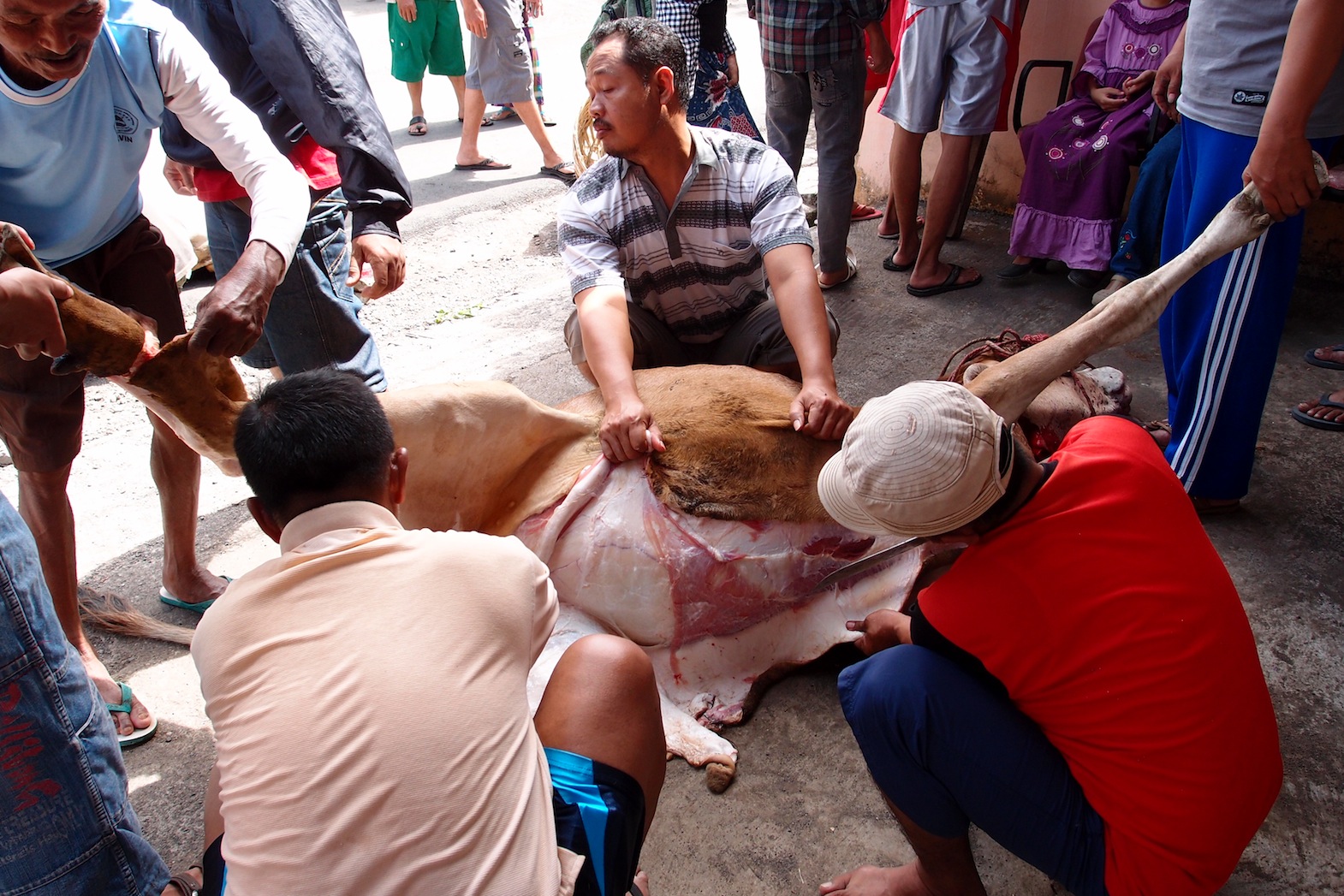 Idul Adha Sacrifice Published October 18, 2013 at 1570 × 1047 in Idul Adha and Other Thoughts on Eating Animals ← Previous Next → Several men help skin and butcher the large bull.